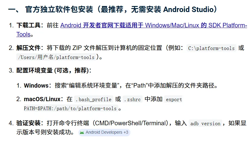 整个过程很简单,半小时可以搞定,唯一有点门槛的是要安装platform-tools-latest-windows,它的安装方法不是双击,而是配置环境,如下图: