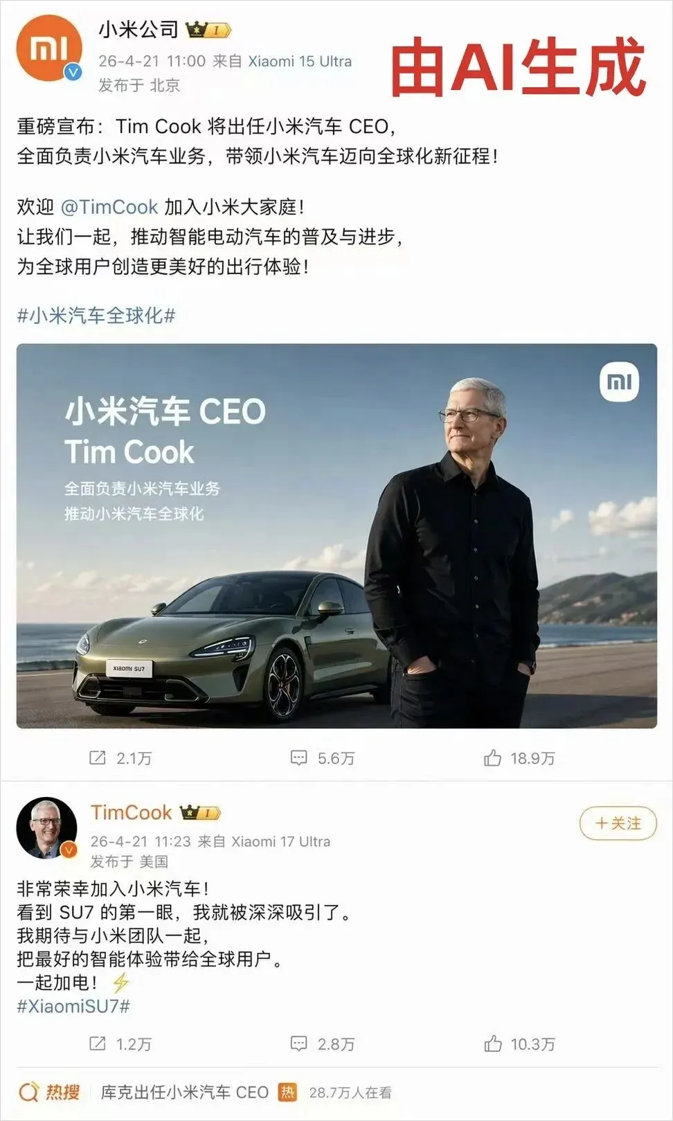 你可能在朋友圈也看到了——那张所谓的”奥特曼直播卖货”截图,或者那张”库克官宣加入小米汽车”的照片。