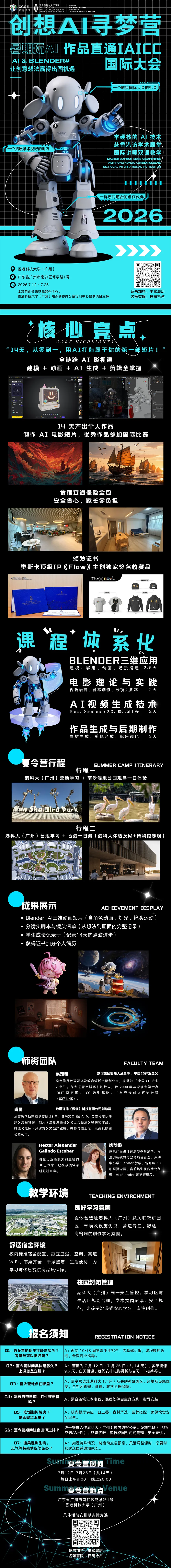 这次 创想AI寻梦营 的特别之处,不只是课程内容本身,更在于整个营期都将在 香港科技大学(广州)校园内 展开。学员将在这里学习、生活、交流与创作,真正进入一种沉浸式的成长节奏。