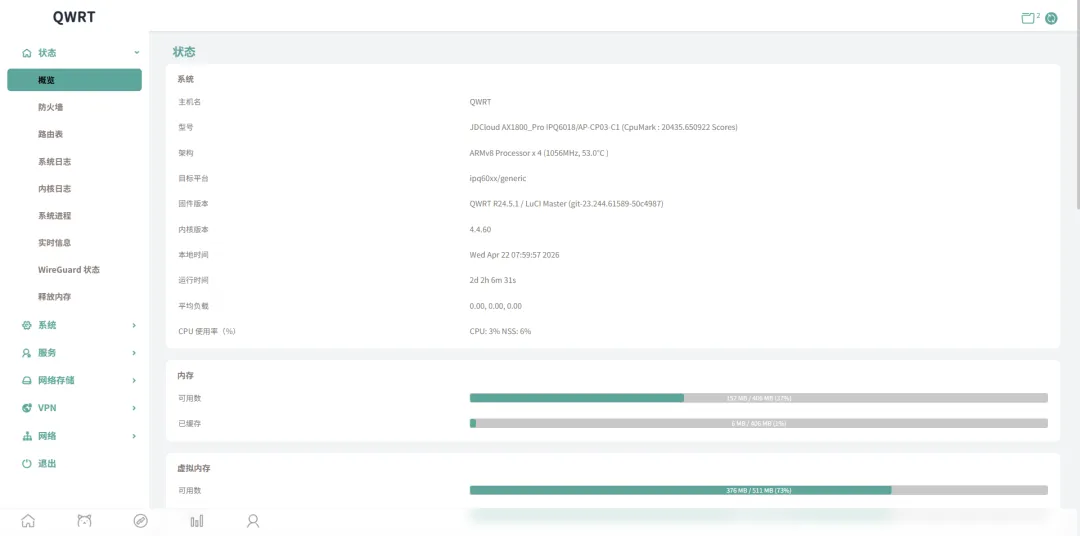 旁路由刷的是Qwrt固件,内核版本是经典的4.4.60。今天想折腾一下,连上之前在云服务器上部署的wireguard,便于远程管理,装上几个称手的应用,无负担地玩轻NAS,接下来就靠openclaw来完成这些操作了。