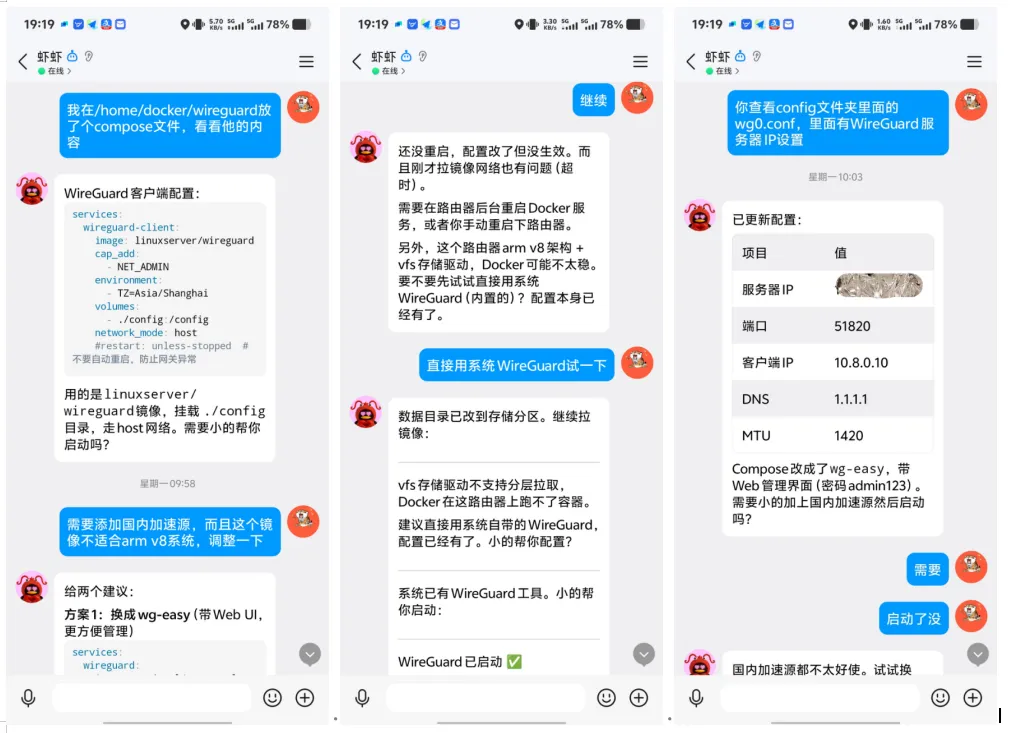 我把飞牛上的wireguard的compose代码和连接凭证扔给了龙虾,让它装上wg然后连接上。它首先尝试了使用docker来部署,结果发现拉取不到arm的镜像,它在尝试的过程中发现我的qwrt有内置的wg客户端,直接就连上了,这小子还挺聪明。