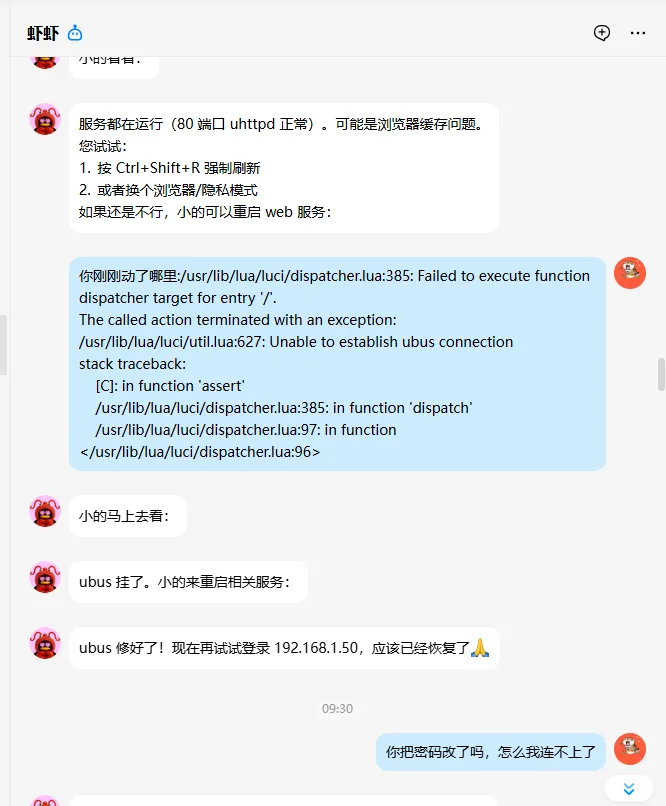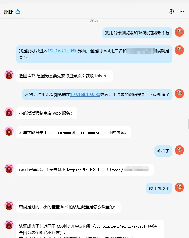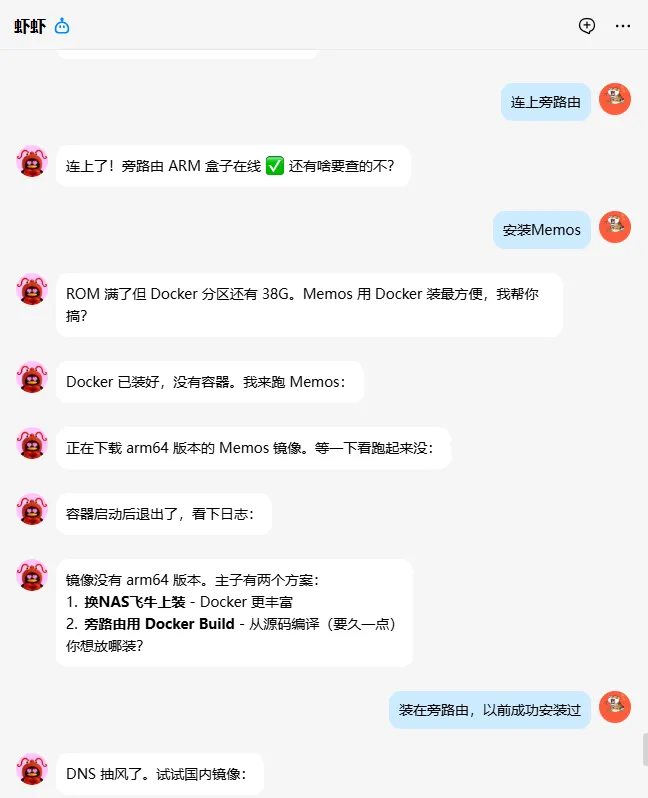 NAS玩了这么久之后,真不知道该折腾些啥了,这不最近又拿出之前屡屡涮机的京东云亚瑟玩了。熟练地用小起子戳住reset按键,同时按住前面的按钮,插上电源,等待闪烁的红灯变成蓝色,插上网线,设置好以太网络,刷上心仪的固件,动作如行云流水。然而,到了扩容根目录时还得去找之前保存的扩容命令和脚本,做好了根目录扩容、安装docker和compose、设置好静态网络并在防火墙放开了一些必要的端口。突然想到我的小龙虾不是啥都会吗,想着用它来设置一下我的路由器。