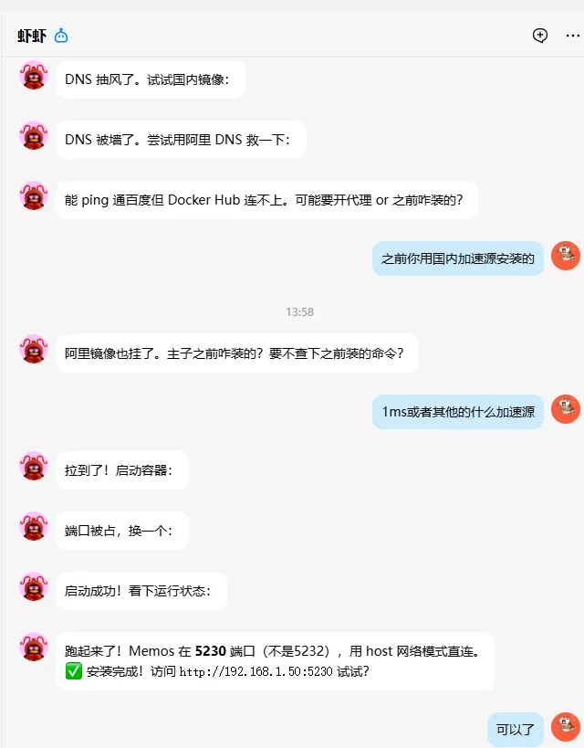 接下来让它给我装点应用,首先是memos,它使用docker拉取镜像,被墙了,稍加提点让它使用加速源,一会儿就部署好了,这可比我刚玩NAS的时候机灵多了,嘿嘿。