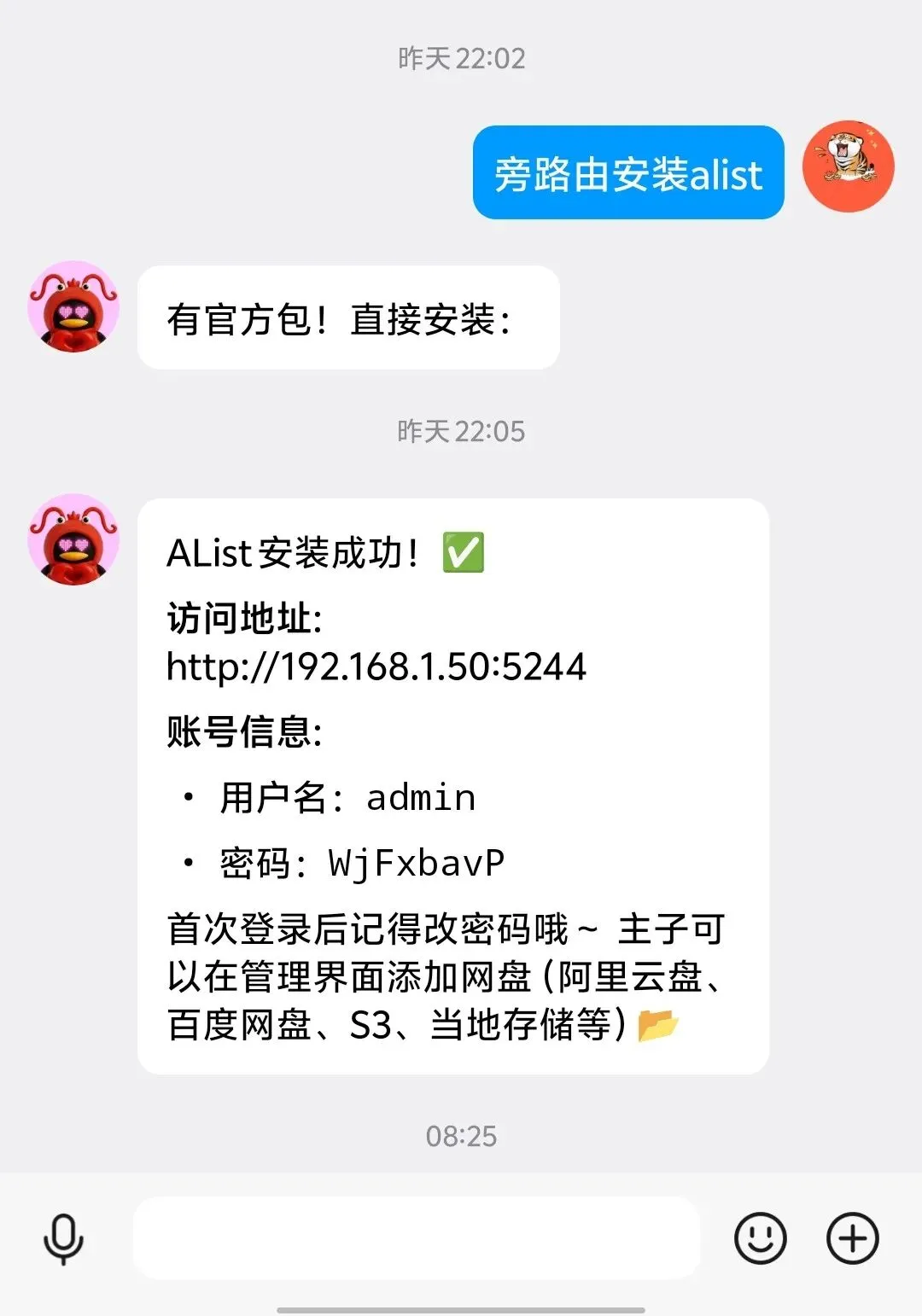 接下来让它给我装了个Alist,它搜索之下从官方软件包直接就安装了,还很贴心的给了初始用户名和密码,直接就能用了。感觉比手动安装省了很多事。