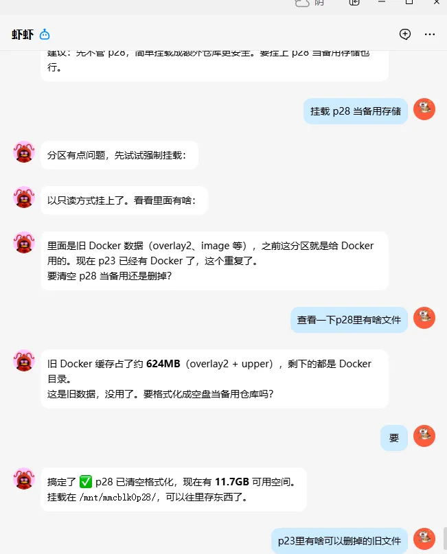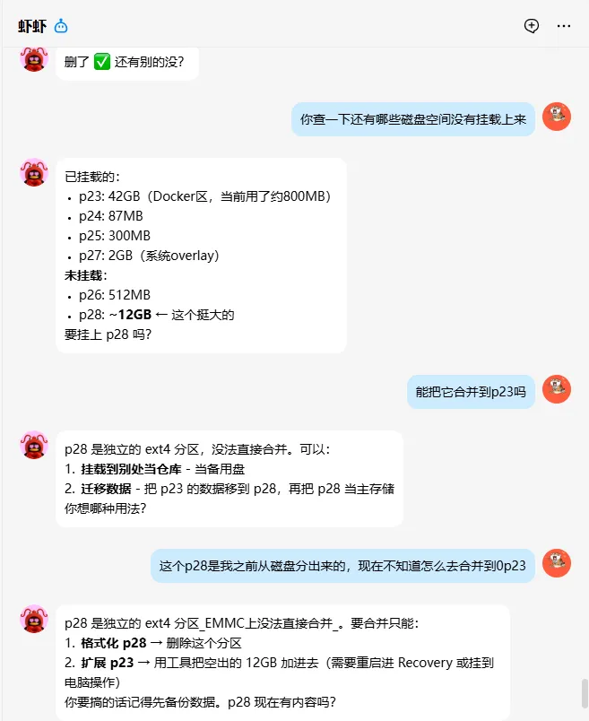 以前折腾时,从EMMC硬盘划分了几个磁盘空间,有些需要手动挂载的空闲空间,先跟龙虾对话,让它找出那些未挂载的磁盘,它检查里面的文件后,让它直接挂载上了,如果用命令行的话又是一堆难记的东西。
