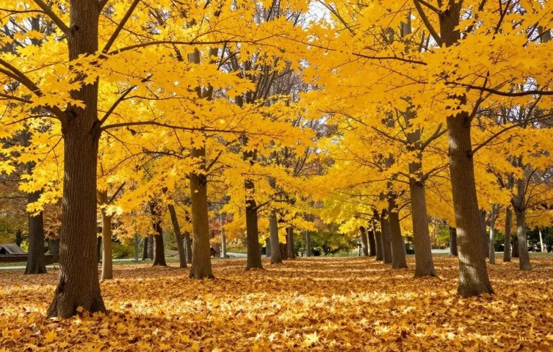 这张图片中没有人物,但是“人情味儿”很浓。地上落叶厚得像铺了地毯一样,踩上去沙沙作响,走几步就会把鞋边染成黄色。树干笔直、间距均匀,可以想象出公园或者老校园的林荫道的样子——以前秋天不流行打卡,人们路过、上课、回家而已,最多抬头说一句“今年叶子黄得真快”。