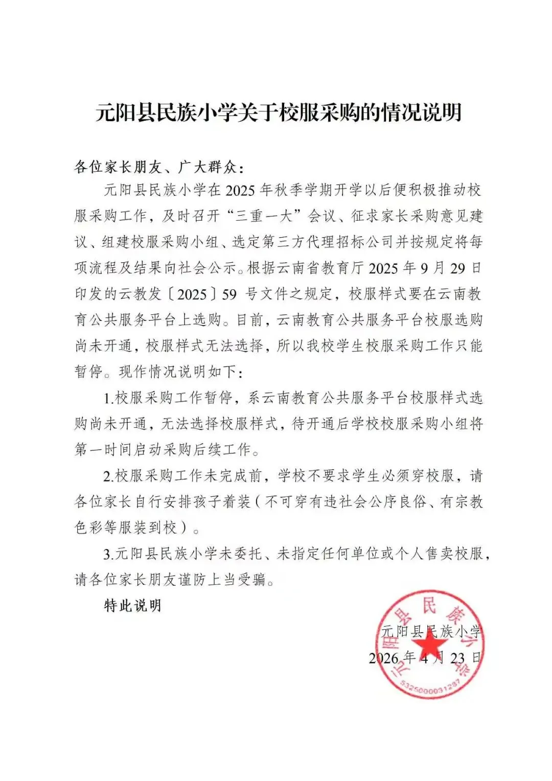 元阳县民族小学关于校服采购的情况说明