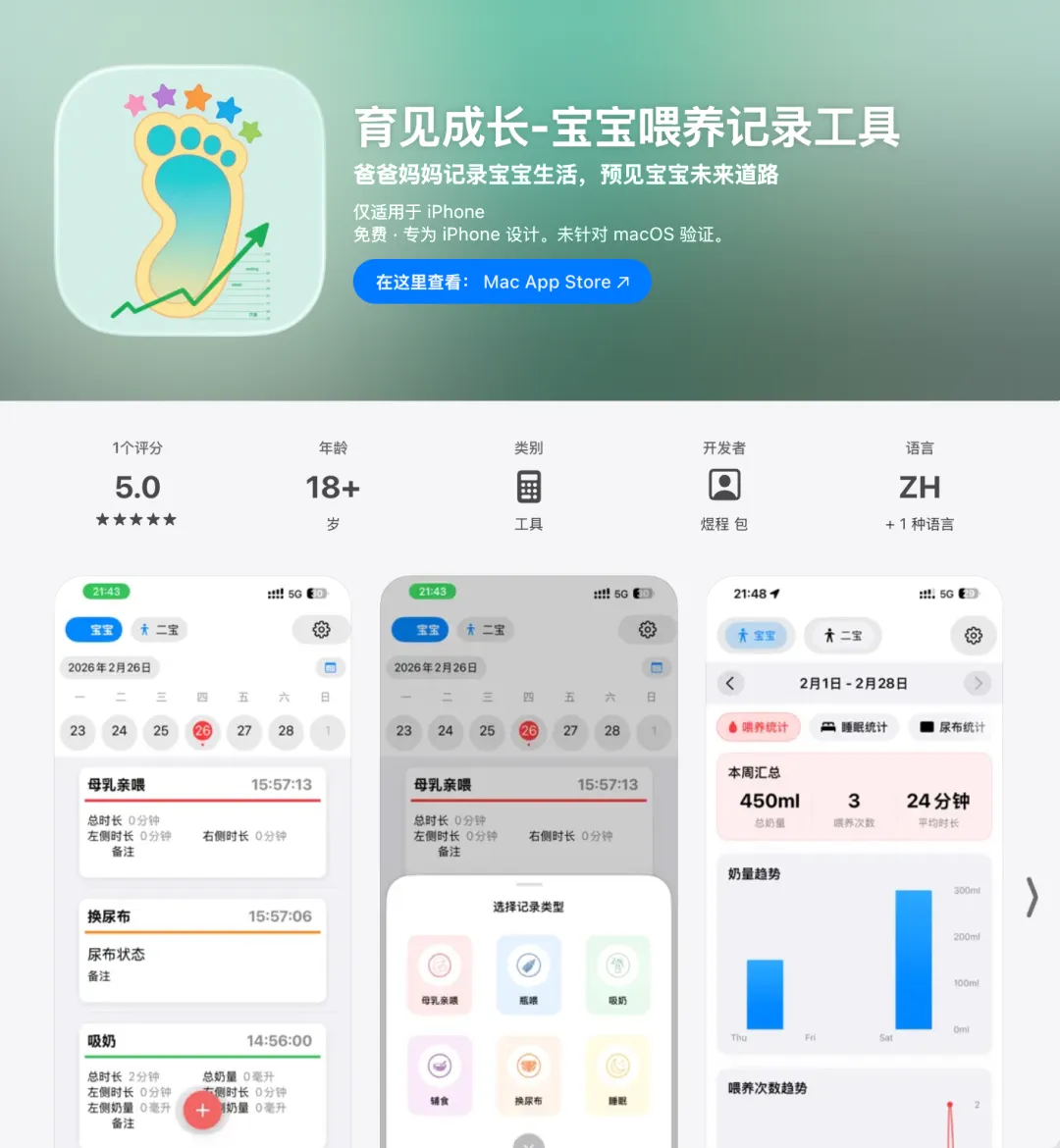 有需要的朋友可以在苹果应用商店搜索 育见成长 直接下载,也可以复制链接 https://apps.apple.com/cn/app/%E8%82%B2%E8%A7%81%E6%88%90%E9%95%BF-%E5%AE%9D%E5%AE%9D%E5%96%82%E5%85%BB%E8%AE%B0%E5%BD%95%E5%B7%A5%E5%85%B7/id6748689997,在手机浏览器中打开跳转至 App Store 安装。