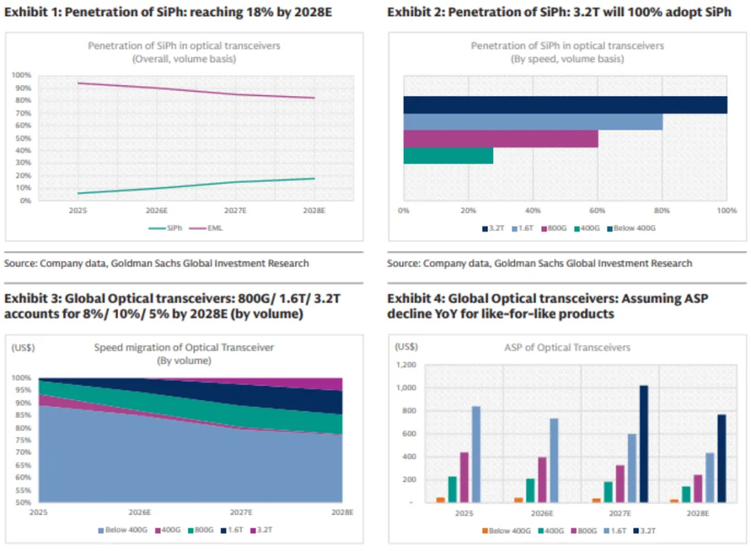 4. 光模块市场份额高阶增长。高盛预计全球光模块市场规模将达到 510亿/730亿/690 亿美元,其中 800G 及以上速率细分市场将以 +31% 的复合年增长率(CAGR)增长,达到 320亿/550亿/560 亿美元。预计 2026 年 800G/1.6T的光模块出货量分别为 3400万/2600 万只,至 2027 年增长至 4500万/4600 万只;同时 3.2T 的光模块出货量将在 2027 年爬坡至 1300 万只。硅光(Silicon photonics)技术将在 800G、1.6T、3.2T 光模块中分别占据 60%、80%、100% 的份额。