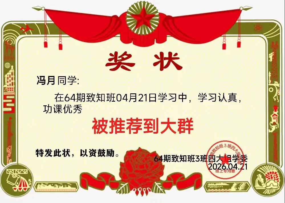 尊敬的博仁老师、各位幸福担当的志愿者老师们、亲爱的第64期致知班的家人们,大家早上好!今天是2026年4月23日,是我们致知班学习的第60天,我是冯月,来自四川,定居在南京,是四大组第18小组学员。很开心受到班委和组委老师们的托举,让我来为大家做点评责善。