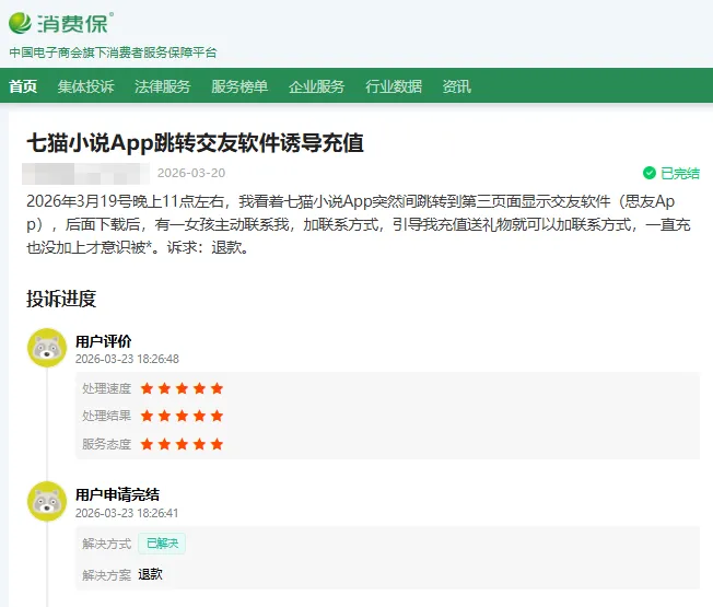 在消费保投诉平台以“交友软件”为关键词搜索,发现有数百条相关投诉,不少消费者投诉交友app存在“虚假宣传”“诱导消费”等问题。如果您对平台的处理结果不满意,还可以上消费保投诉平台发起投诉!消费保作为中国电子商会旗下的服务保障平台,已经为数万名消费者解决相关投诉!