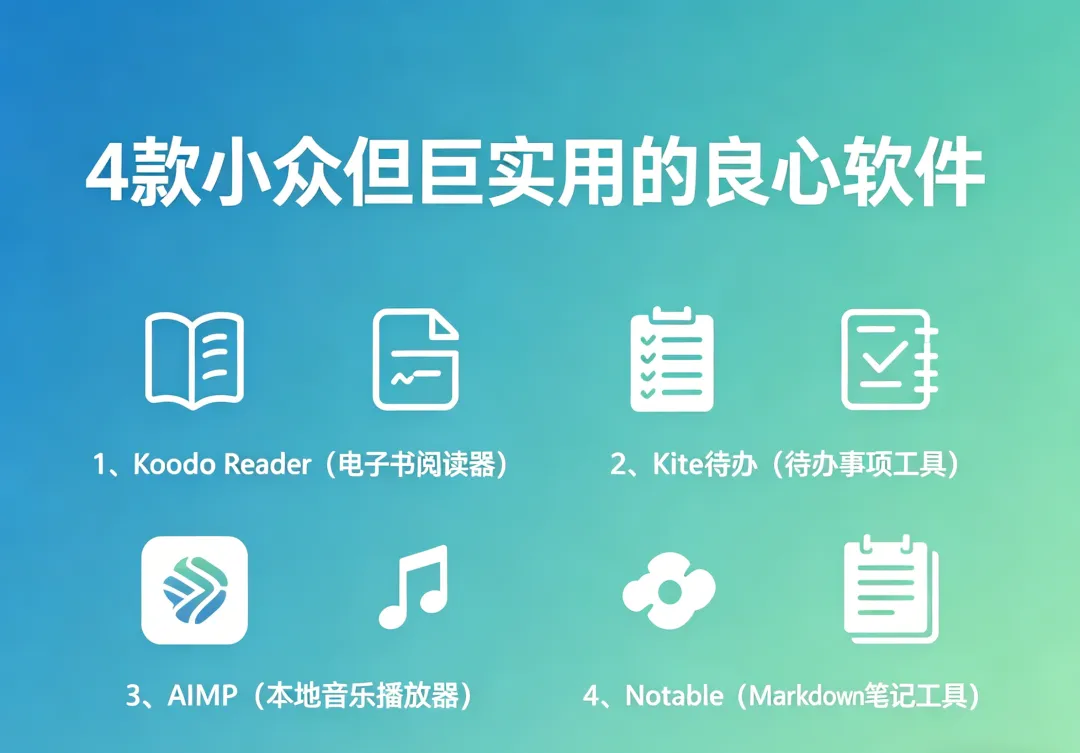 📋 本期软件目录▼:1、Koodo Reader(电子书阅读器) 2、Kite 待办(待办事项工具) 3、AIMP(本地音乐播放器) 4、Notable(Markdown笔记工具)