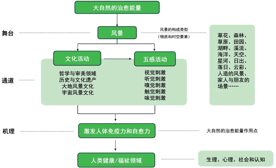 Research on healing landscapes focuses on the interactive relationship between environmental characteristics and human health. From the perspective of scenery construction, this research proposes a theoretical framework of scenery healing. Natural healing energy enters the human body through sensory stimulation and spatial cultural experiences, improving immune functions and self-healing capacities. By synthesizing existing healing practices into a coherent theoretical system, this research provides foundational support for establishing scenery healing as a branch of landscape architecture, representing an evolution from perceptive restoration to health promotion.