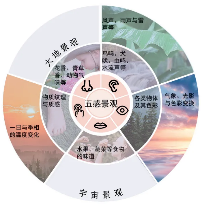 1) Constituent elements: Material elements include natural scenery and artificial scenery. Spatiotemporal elements include earth scenery, which reflects ecological evolution, and universe scenery, which presents dynamic meteorological phenomena.