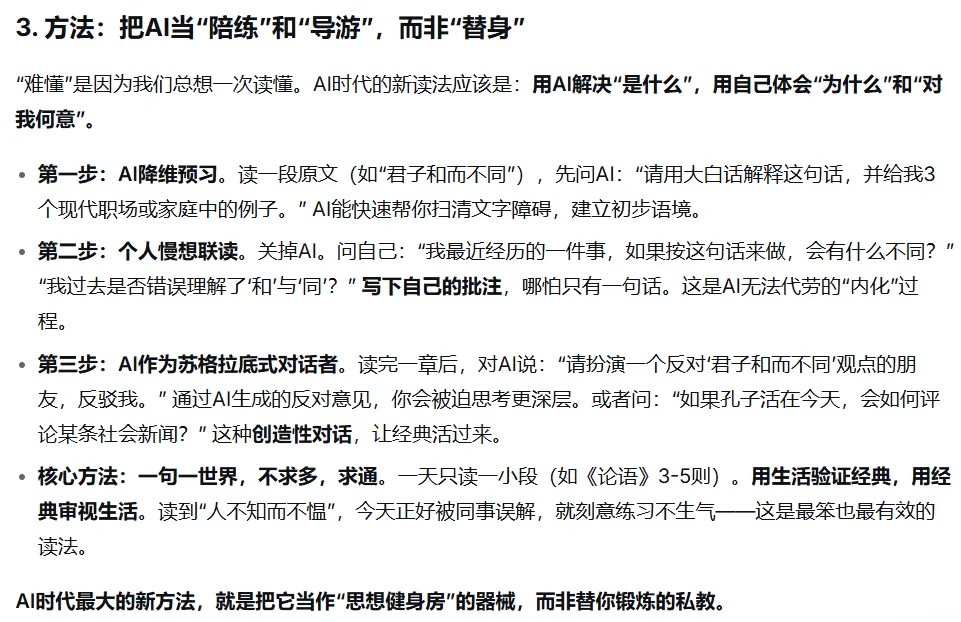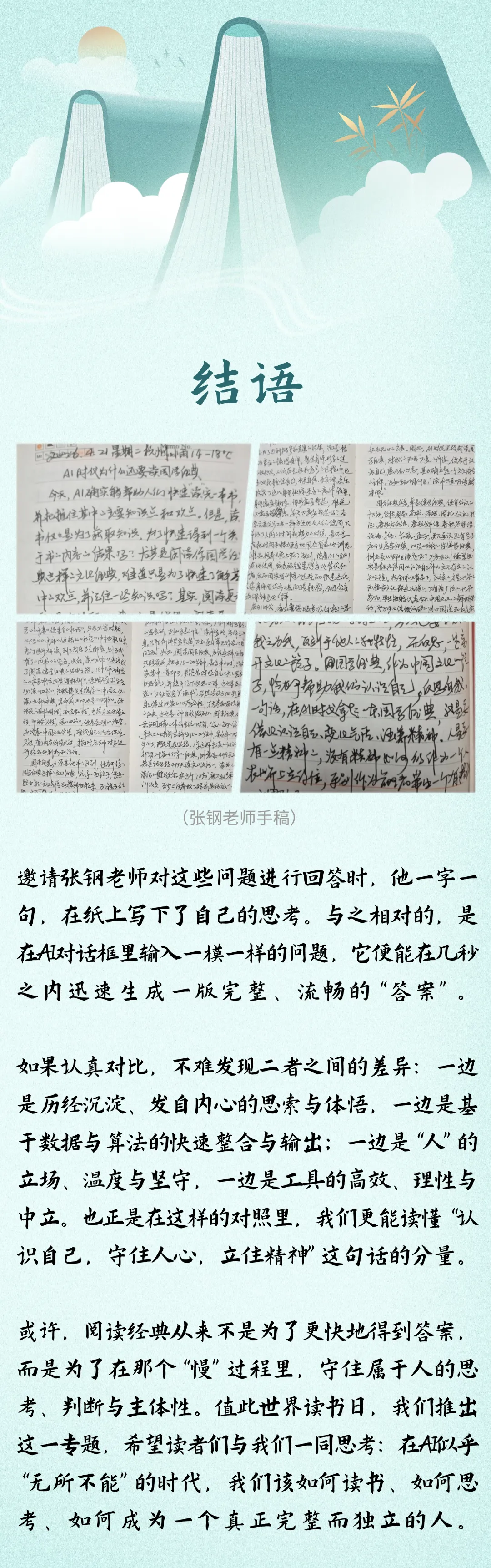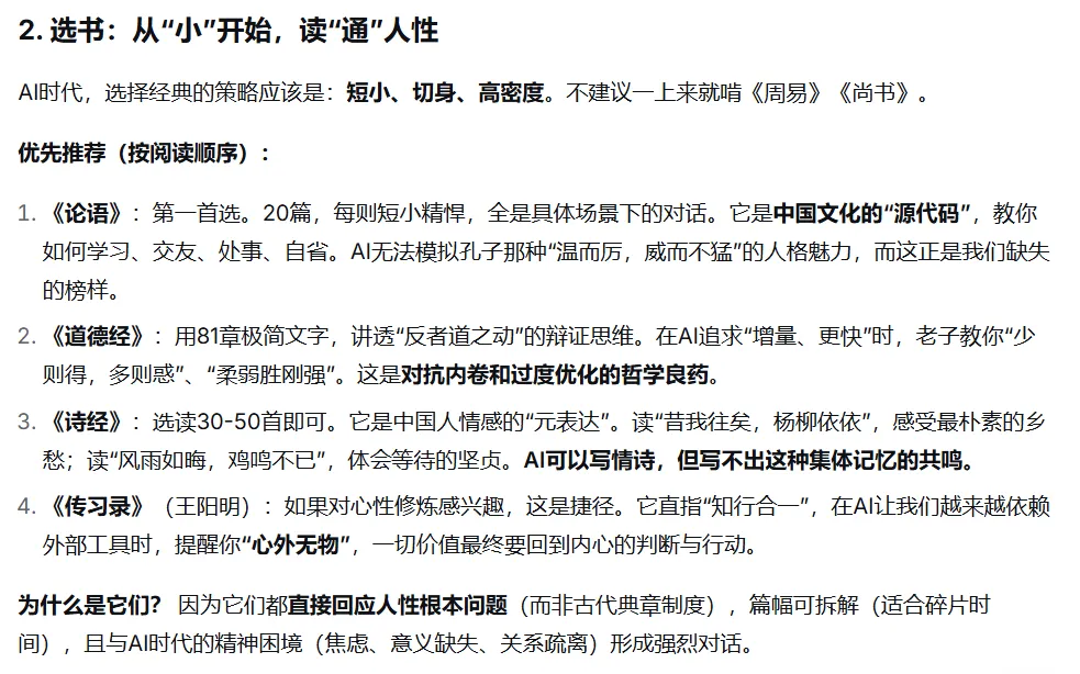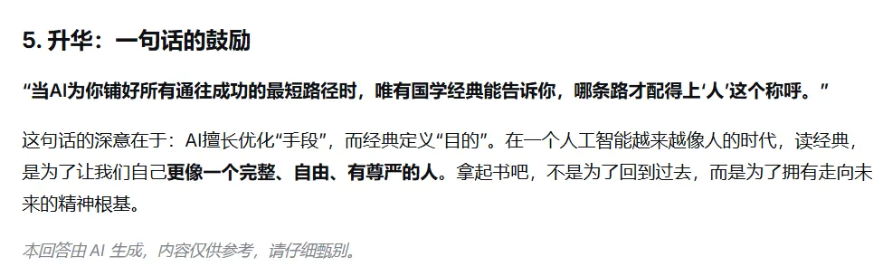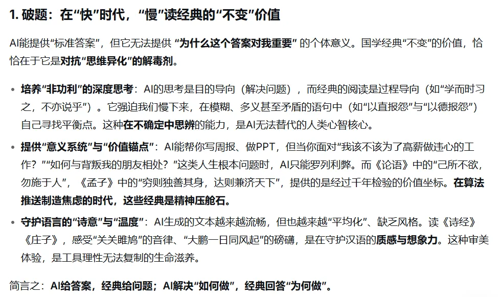 今天,AI确实能帮助人们快速“读完”一本书,并把握住书中的主要观点和知识点。但是,读书仅仅是为了获取知识、为了快速得到一个“关于书的主要内容是什么”的结果吗?尤其是阅读像国学经典这样的文化经典,难道只是为了快速了解其内容,并记住一些词句吗?