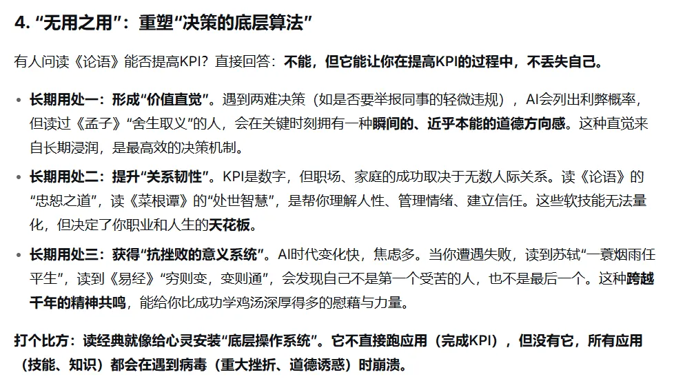 一句话,在AI时代拿起一本国学经典,就是要借此认识自己、变化气质、涵养精神。人总是要有一点精神的。没有精神,如何能作为一个大写的人,立于天地之间?更别说作为一名管理者,还想要带出一个有精神的团队了。