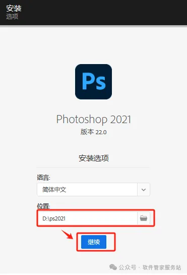 第四步:在D盘建一个名为PS2021的文件位,安装时选择此文件夹,并点继续。