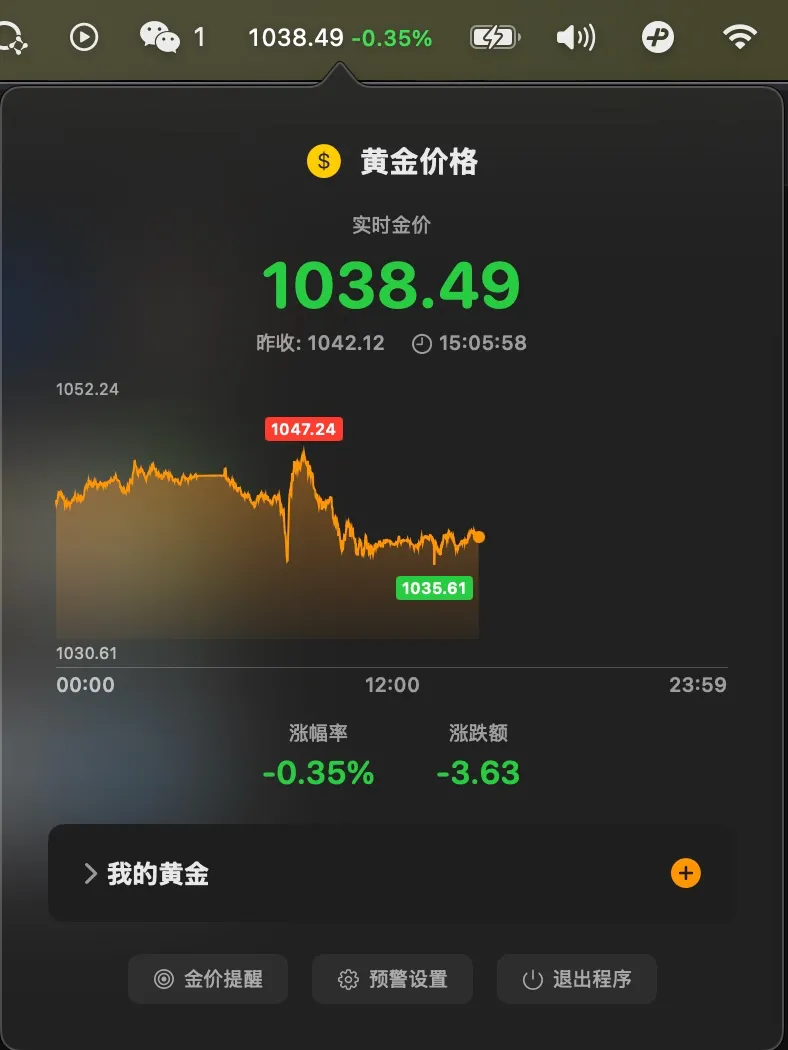 底部放了四个入口:我的黄金、金价提醒、预警设置、退出程序。功能不多,但都是我平时会点开的。做给自己用的东西,核心原则就是别让我多想。