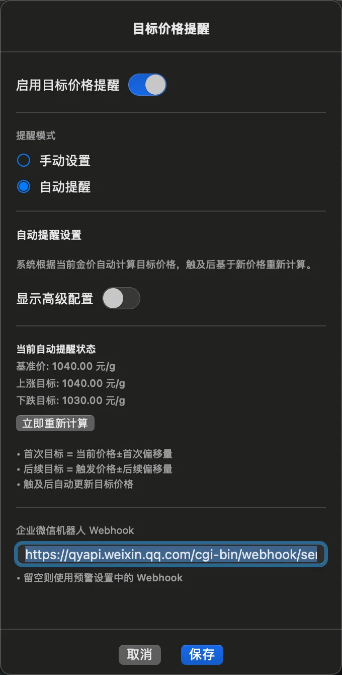 这是我花心思最多的部分。你可以设一个目标金价,到了就推通知。但问题是——金价每天都在动,昨天觉得 1040 是低点,今天可能就变成高点了。手动改来改去很麻烦。