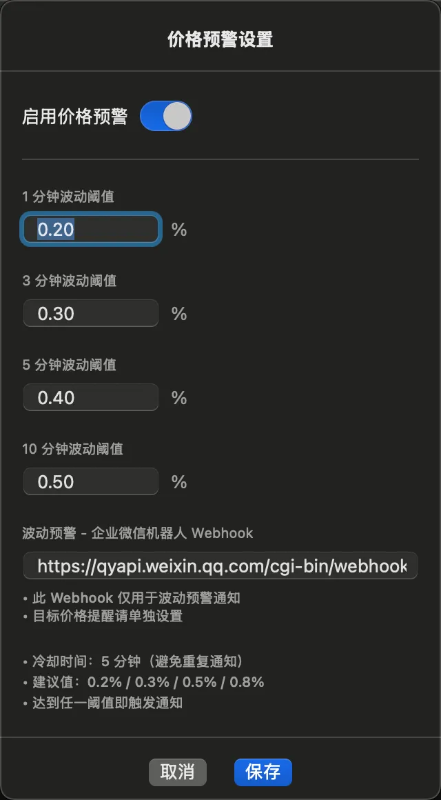 除了固定目标,短时间内的大幅跳动也值得注意。程序里加了 1 分钟、3 分钟、5 分钟、10 分钟四个维度的波动阈值,默认分别设了 0.2%、0.3%、0.4%、0.5%。