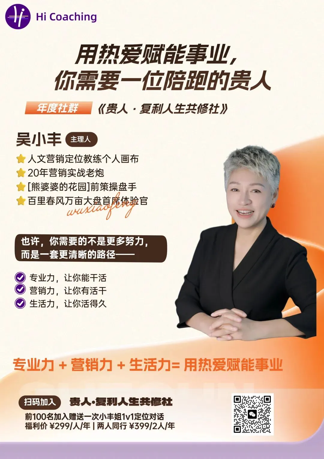 吴小丰之所以可以做这件事,不只是因为有热情,更因为有长期实战和持续探索。二十五年的营销与团队经验,让她对策略、市场、客户和人的成长有真实体感,也服务过大量客户。她知道,找到自己、把热爱变成可持续的事业,从来不是靠知识点堆出来的,而是在行动、追问、反馈和验证中,慢慢活出来的。她愿意做那个陪伴大家一起看见自己、走向自己的人。