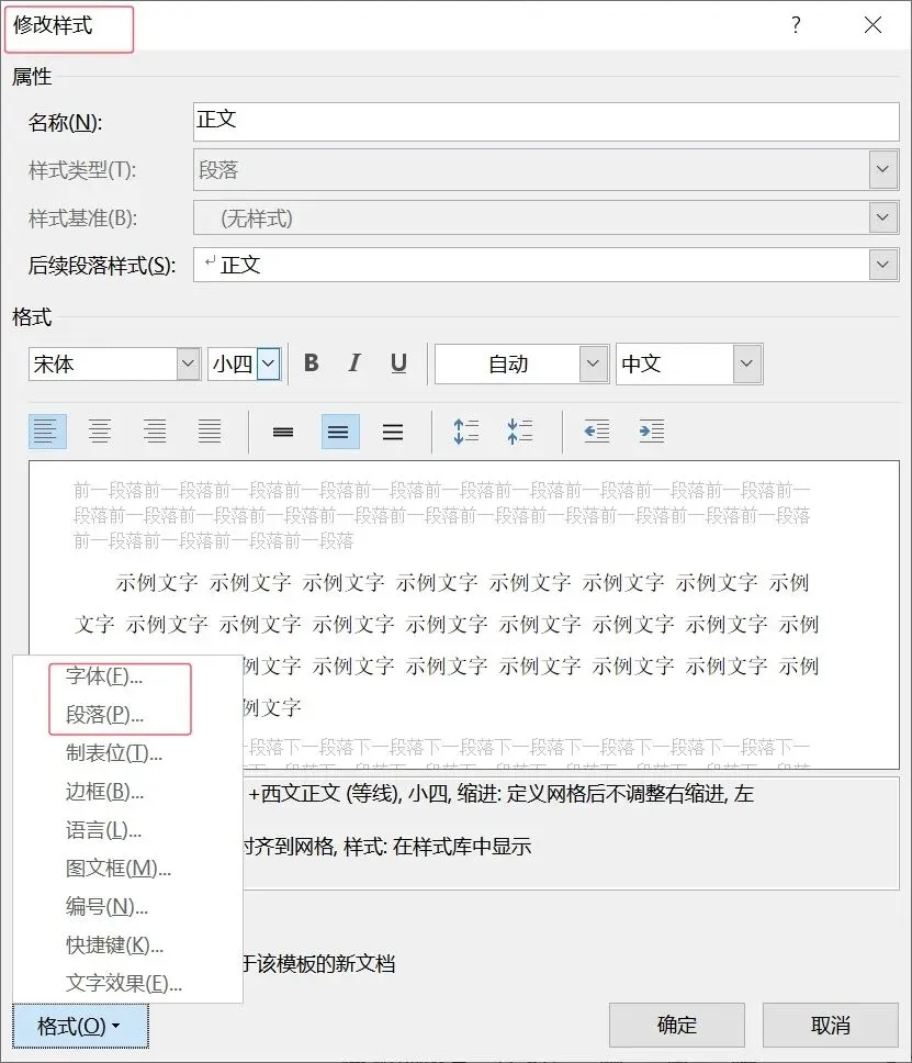 内置样式不符合需求?比如正文想改成宋体、小四、1.5倍行距,标题想改成黑体、二号、居中,很简单。右键点击样式面板里的“标题1”或“正文”,选择“修改”,在弹出的窗口里,设置字体、字号、行距、段前段后间距,确定后,全文所有套用该样式的内容,都会自动同步更新,不用一个个修改。