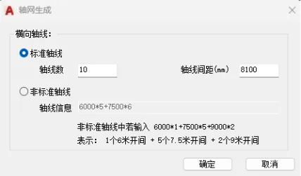 点击【轴网】菜单,弹出轴线生成对话框,可输入标准轴线和非标准轴线,确定后屏幕显示生成的横轴线,供后面的刚架布置用。