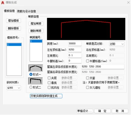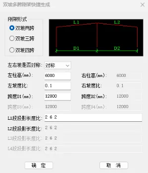 点击【双坡多跨刚架快捷生成】菜单,弹出对话框,进行信息输入。