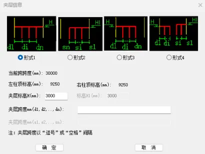 【夹层柱间距】:根据选择的夹层形式,根据图示尺寸输入夹层柱间距尺寸,夹层柱间距用英文的“逗号”或“空格”间隔。