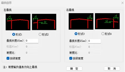 选择左悬挑或者由悬挑,然后选择悬挑形式,输入悬挑长度,如果和梁坡度一致,则直接勾选按梁坡度,坡度输负值表示向上悬挑。点击确定完成参数设置。