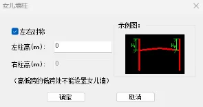 女儿墙参数选择是否左右对称,输入左右女儿墙柱高度,点击确定完成女儿墙柱的参数设置。