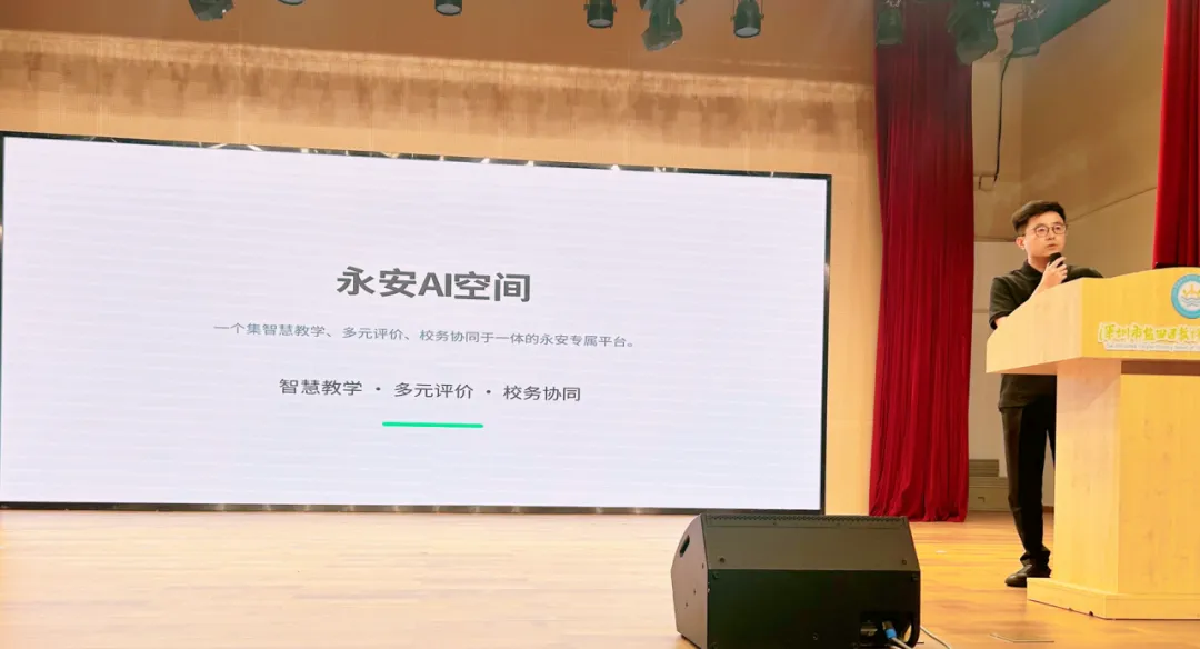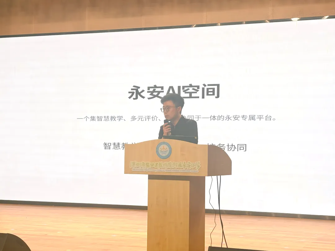 发布环节,刘欢主任围绕平台建设历程与核心价值进行详细介绍。他提到,当前人工智能技术飞速发展,我校作为深圳市人工智能教育应用实验校和先锋学校,始终秉持扎实探索、沉心耕耘的理念,稳步推进人工智能教育应用建设。经过前期大量实践探索与实验校方案落地,学校正式推出一站式智慧教育平台——永安AI空间,这标志着我校人工智能教育应用从单点尝试走向体系化、集约化、校本化发展新征程。