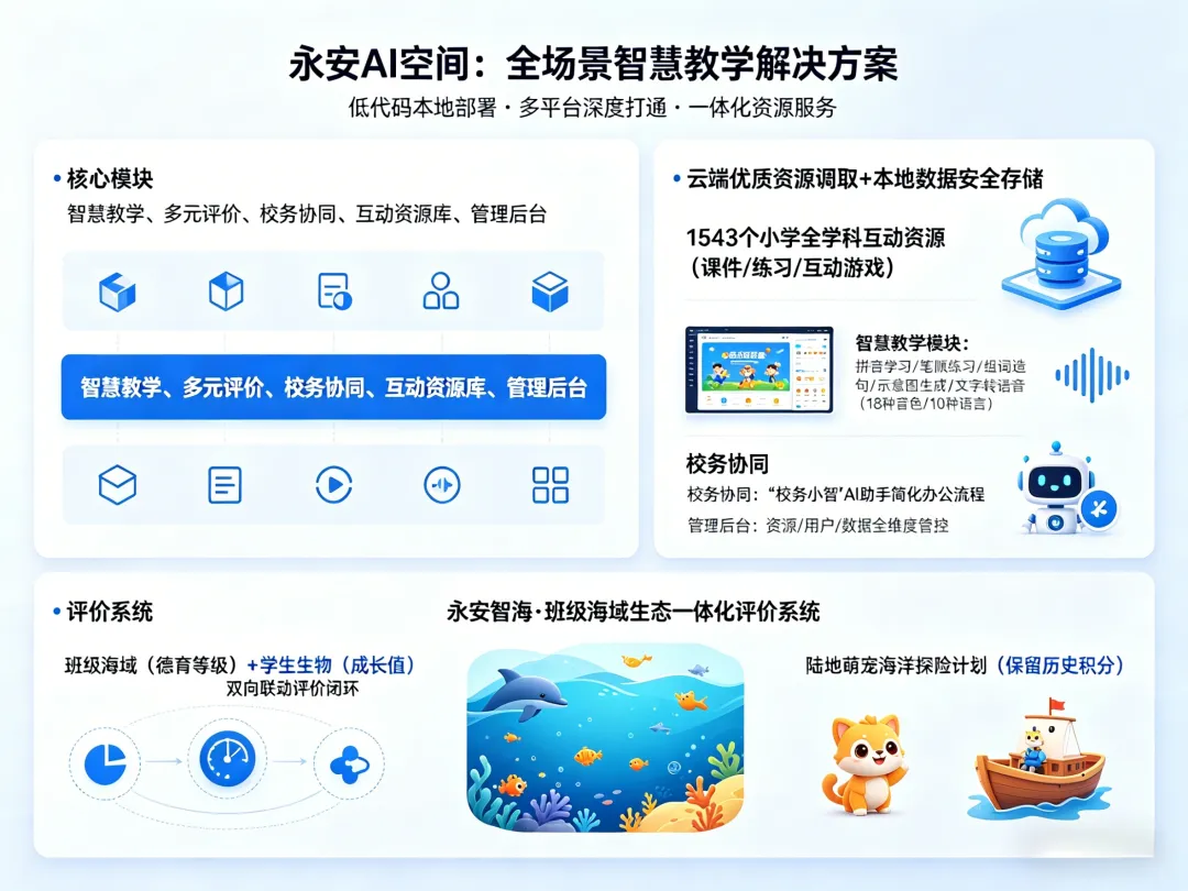 平台聚焦智慧教学、多元评价、校务协同、互动资源库、管理后台五大核心模块,内置1543个覆盖小学全学科、全学段的优质互动教学资源,涵盖课件、练习、互动游戏等多元类型。智慧教学模块搭载汉语拼音学习、汉字笔顺练习、智能组词造句、AI示意图生成、有声资源库等实用功能,精准服务课堂教学;校务协同模块通过“校务小智”AI智能助手,简化日常办公流程;管理后台实现资源、用户、数据全维度管控,为教学与管理提供精细化支撑。
