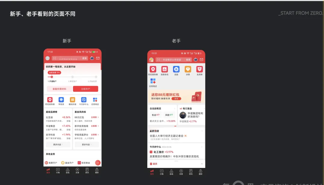 小白用户: 看到的是红包、模拟盘、理财百科,用游戏化的方式降低门槛。