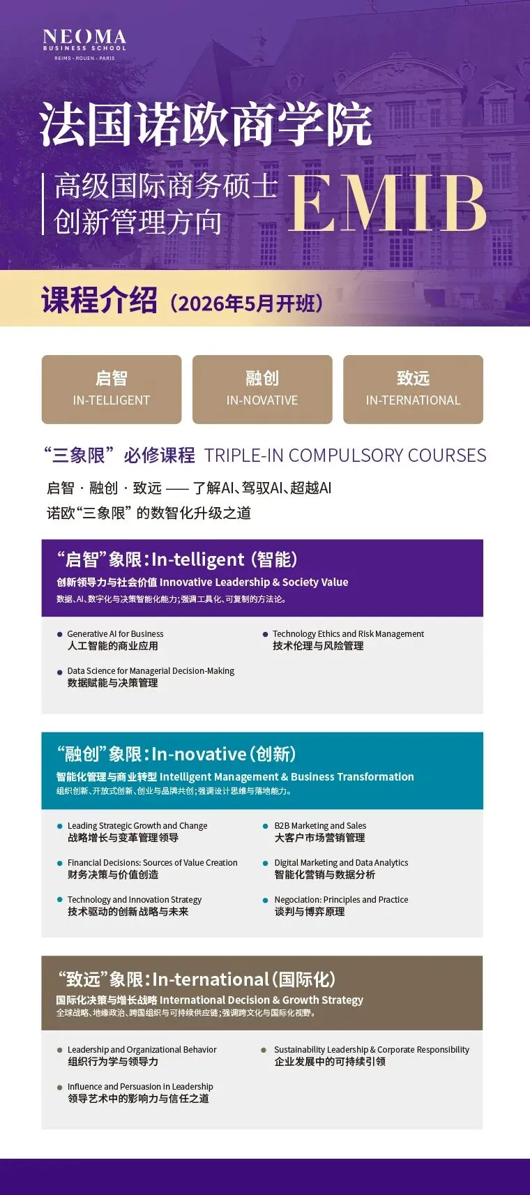 法国诺欧商学院(NEOMA Business School)推出的EMIB高级国际商务硕士(创新管理方向),为在职管理者与行业精英提供了一条高效、权威的进阶路径。