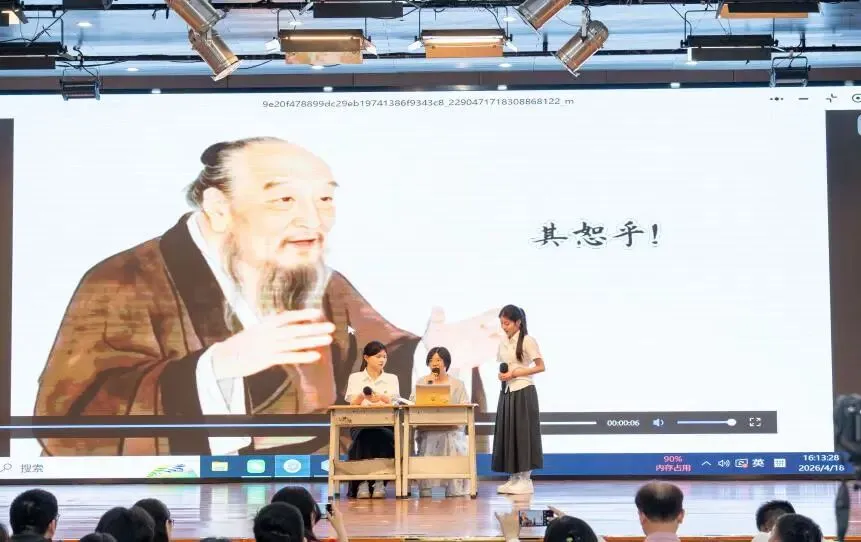 “师生同台”是本次比赛的鲜明特色与核心要求。我校剧目将真实的师生关系与教学场景艺术化地融入剧情。剧中,由我校语文教师简纯纯所饰演的“引导者”角色,与由两位学生谢景柠、陈晓萱饰演的“困惑青年”形成了极具张力的舞台互动,从后台叶鑫泉同学启动“AI孔子”程序开始,到师生共同解读“仁”的当代内涵,每一次交流、每一个眼神、每一段碰撞,都生动再现了教育中“启发”与“探索”的本质过程。从“问”到“答”,再到“悟”与“行”,表演完整地呈现了青年一代从接触经典、理解经典到最终认同并决心践行经典精神的心路历程。汕头大学的于莎莎博士作为评委代表发言时指出,该作品“演活”了《论语》,特别适合我们课堂上的应用,有强大的推广性,最后“士不可以不弘毅,任重而道远”一句的复现更具有启迪性,展现了新时代青年的责任感。