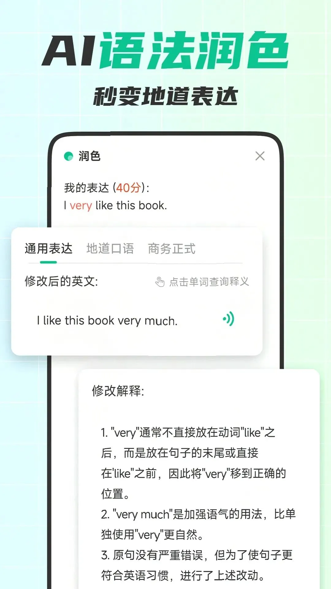 趣味与实用兼顾,轻松坚持:融入游戏化学习机制,以闯关奖励激发练习动力,还有热门话题和时事新闻素材,保持学习新鲜感;每日打卡提醒,帮你轻松养成长期学习习惯。