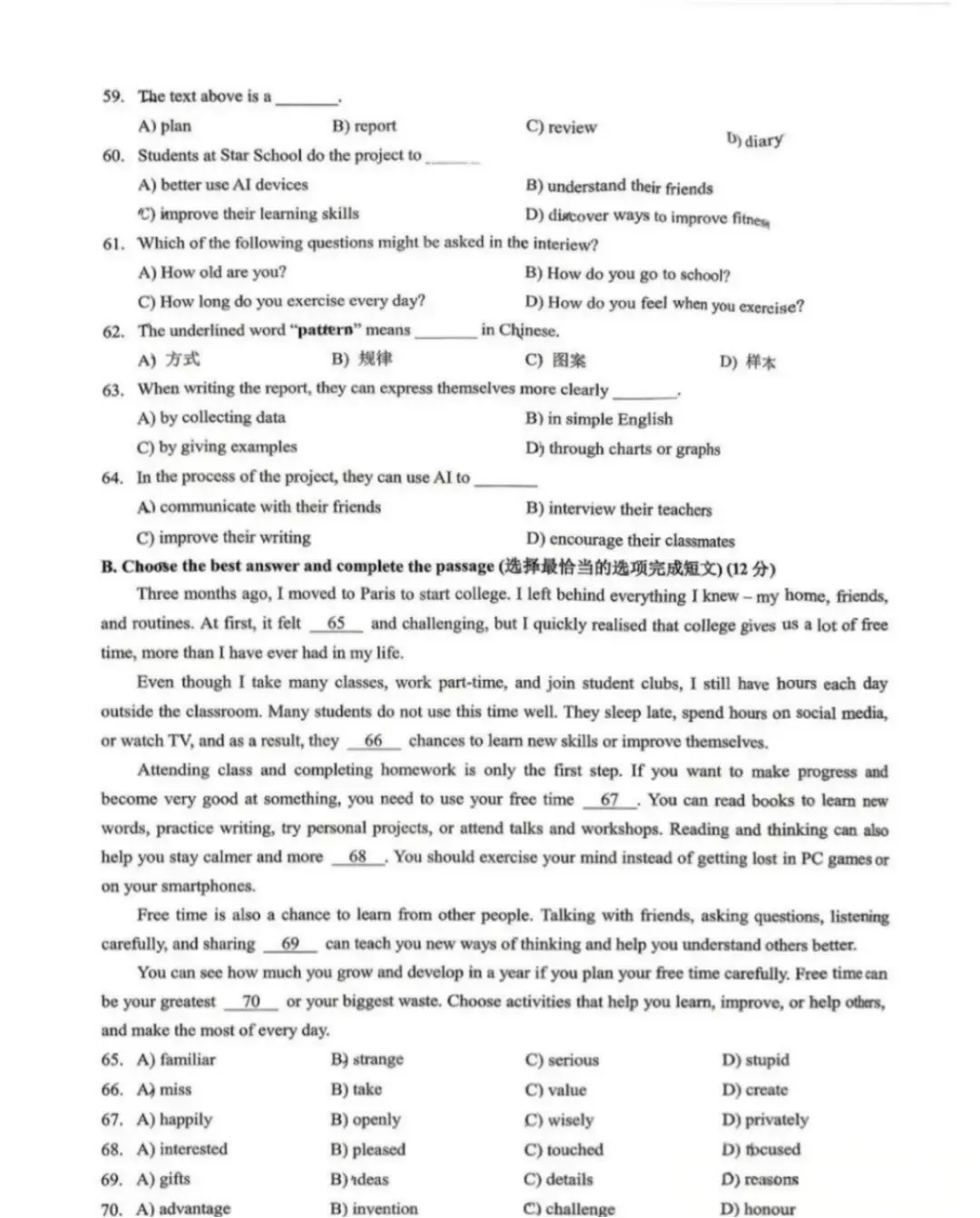 B. Choose the best answer(12分)