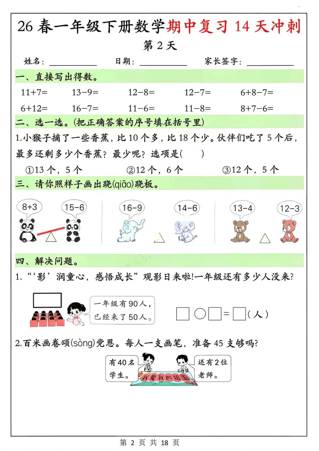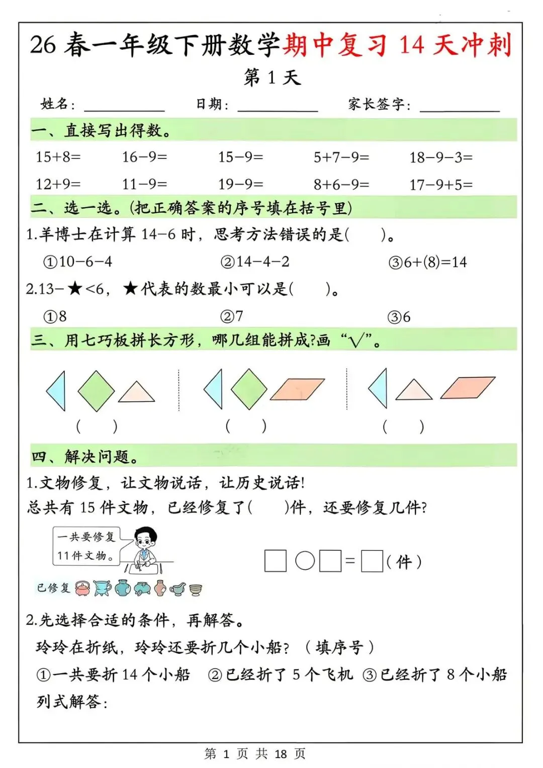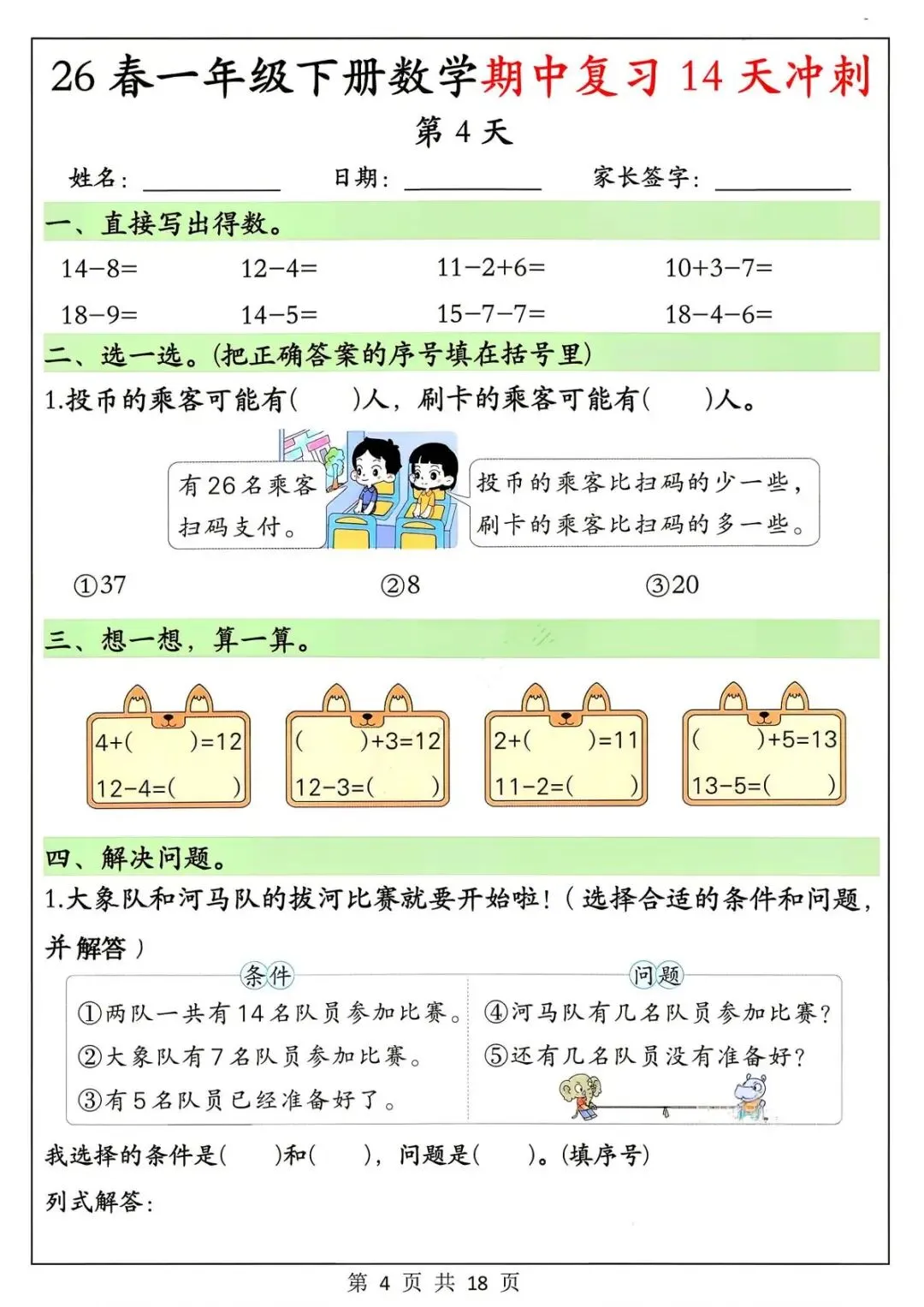 26春一年级下册数学期中复习14天冲刺【电子版可下载】