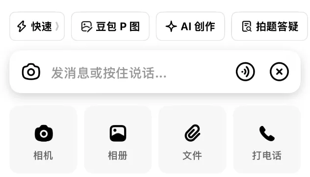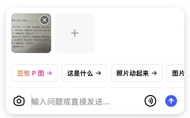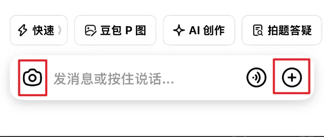 打开豆包APP,在底部输入框的左侧,点击“相机”图标(或“+”号里的拍照功能)。