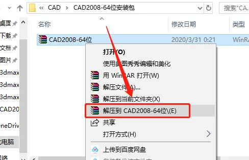 1.打开下载的软件安装包,鼠标右击压缩包【解压到CAD2008-64位】。