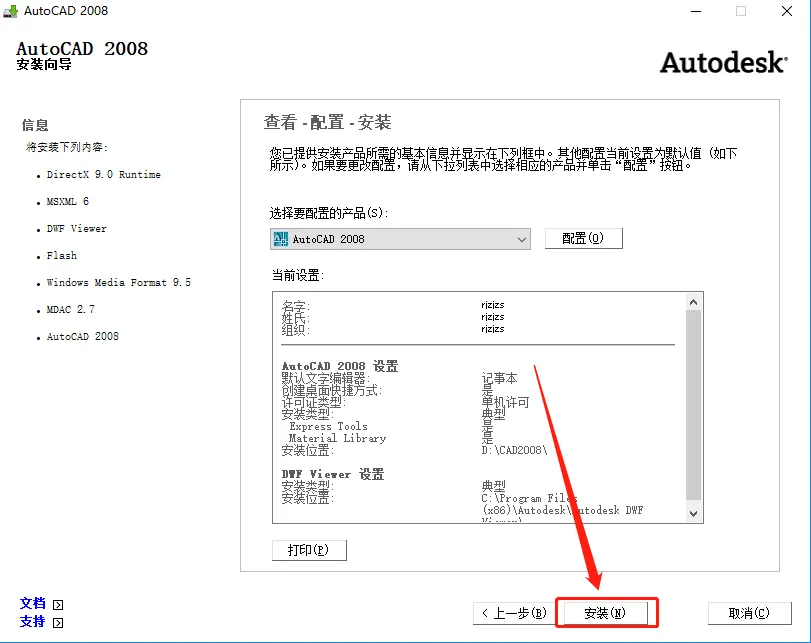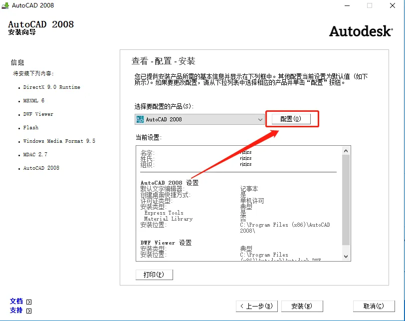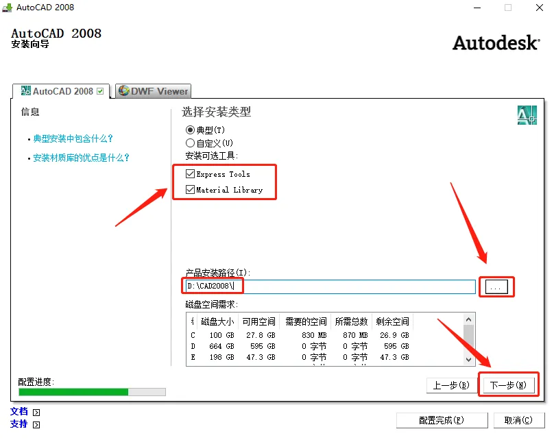 13.勾选【Express Tools】和【Material Library】后,点击右边的【···】图标设置软件安装路径,不建议安装路径为C盘,我这里选择安装到D盘,并在D盘创建了一个名为CAD2008的文件夹,设置好安装路径后点击【下一步】。