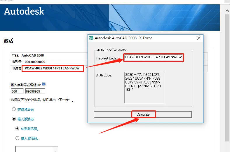 23.使用【Ctrl+C】快捷键复制申请号,然后使用【Ctrl+V】快捷键粘贴至注册机的Request code方框中,粘贴好后点击注册机中的【Calculat】。