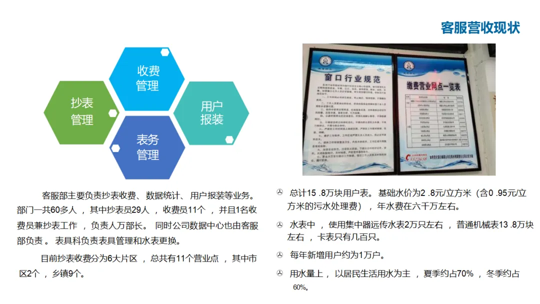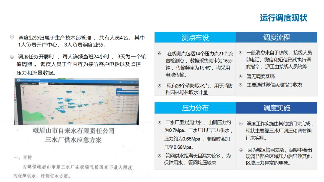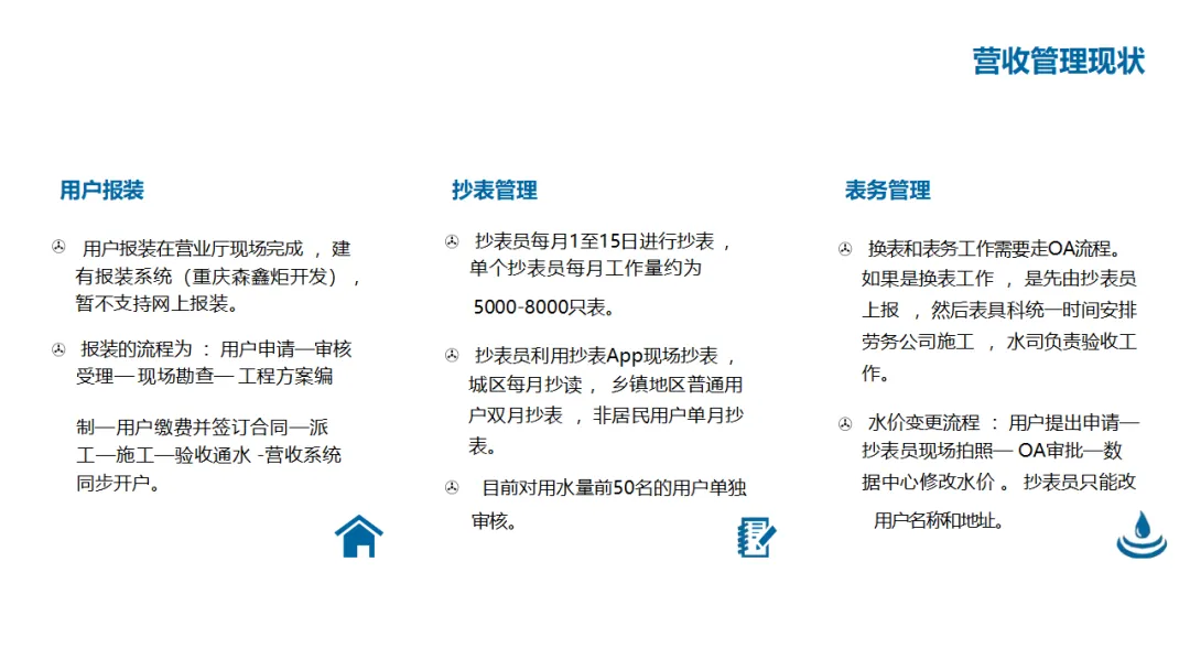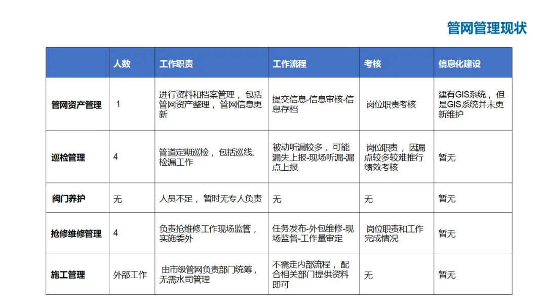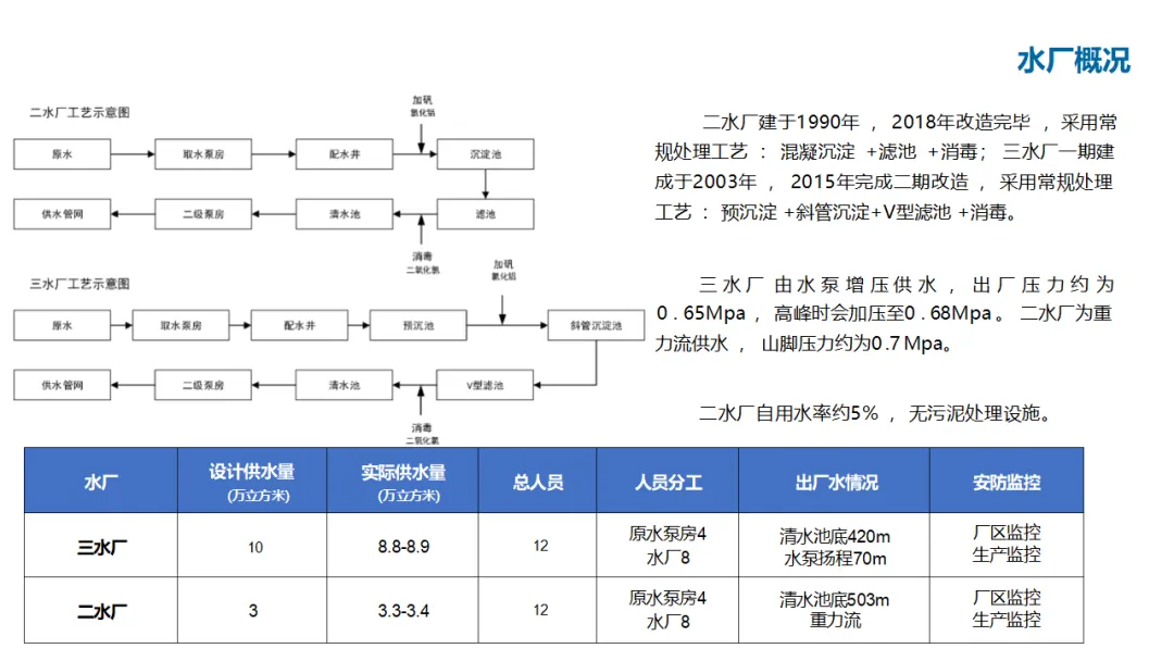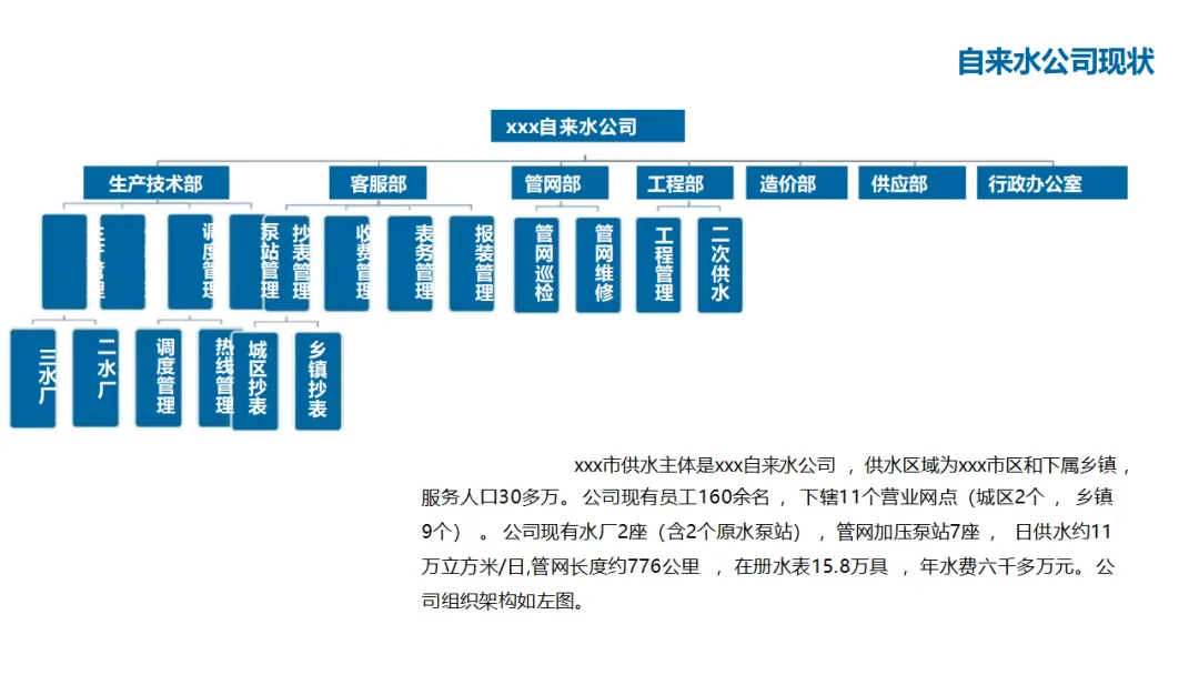 建设内容涵盖:自控管理(统一PLC选型、实现远程感知与安全可控);在线监测体系(厂站网一体化感知);管网管理(以GIS为底图的内外业一体化,实现设计、施工、运维闭环);调度管理(在线水力模型、科学调度与应急响应);工单管理(统一派工、过程监控、人员考核);产销差管理(分区DMA计量、主动检漏、表务强化、绩效考核);客户服务(网上营业厅、微信小程序、账单推送、停水精确推送);商业模式创新(二次供水合资合作、5G联合营销、用水数据精准营销)。
