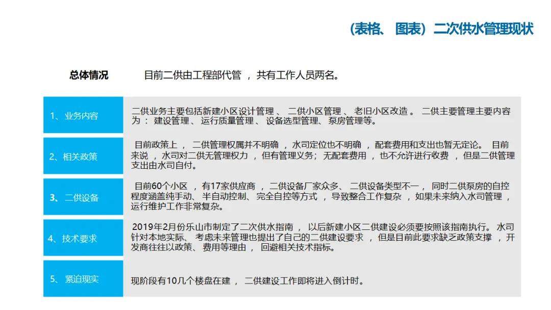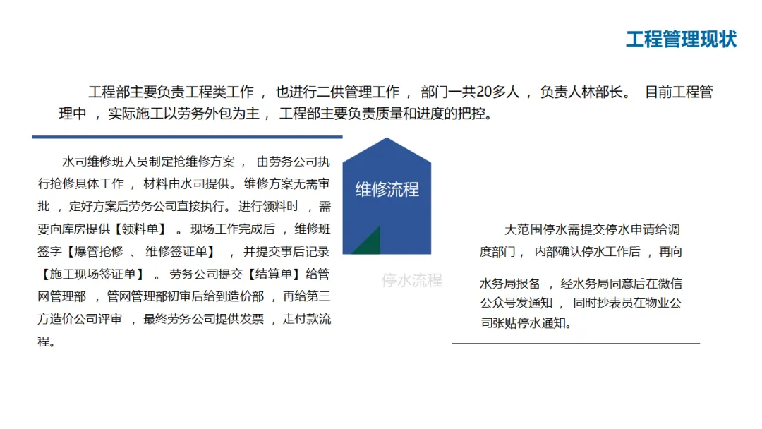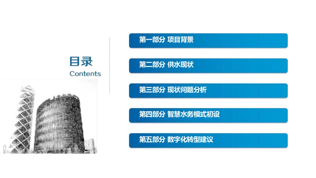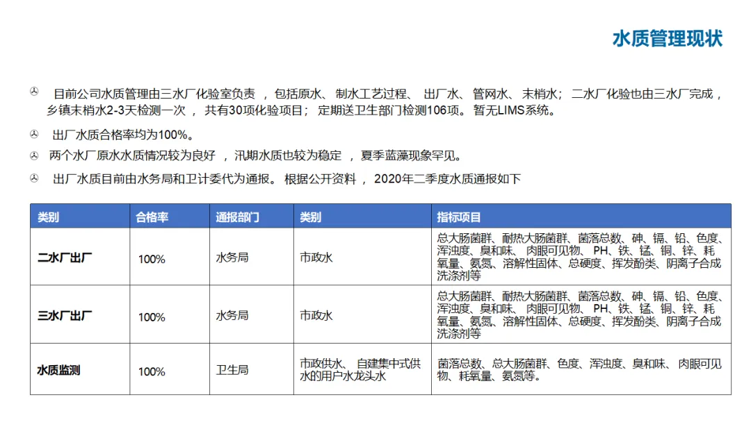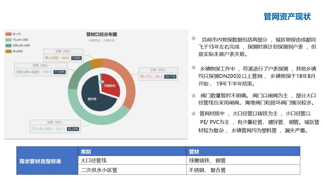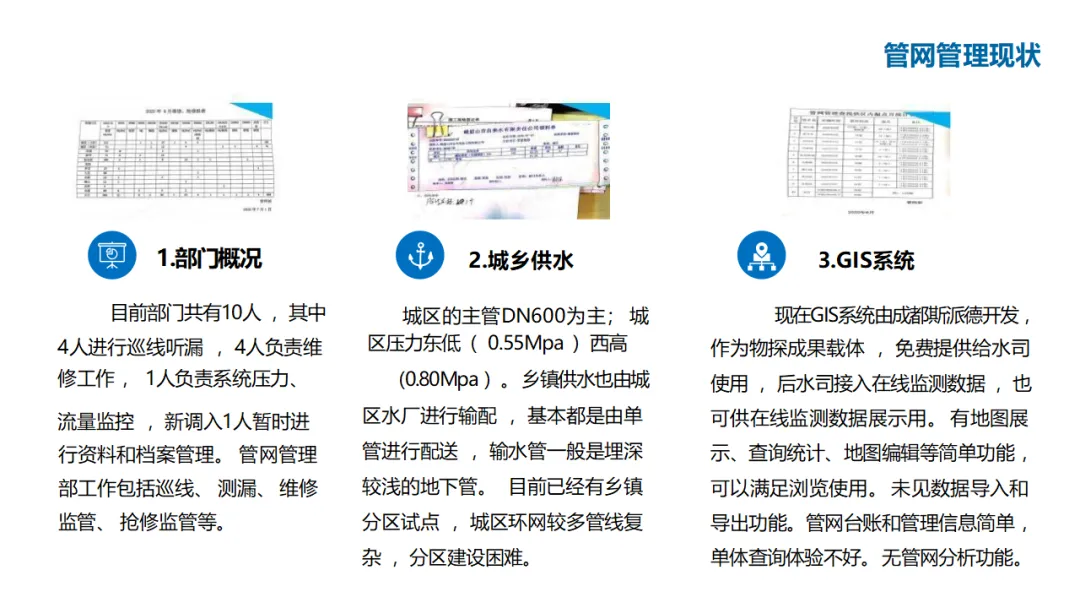 建设内容涵盖:自控管理(统一PLC选型、实现远程感知与安全可控);在线监测体系(厂站网一体化感知);管网管理(以GIS为底图的内外业一体化,实现设计、施工、运维闭环);调度管理(在线水力模型、科学调度与应急响应);工单管理(统一派工、过程监控、人员考核);产销差管理(分区DMA计量、主动检漏、表务强化、绩效考核);客户服务(网上营业厅、微信小程序、账单推送、停水精确推送);商业模式创新(二次供水合资合作、5G联合营销、用水数据精准营销)。