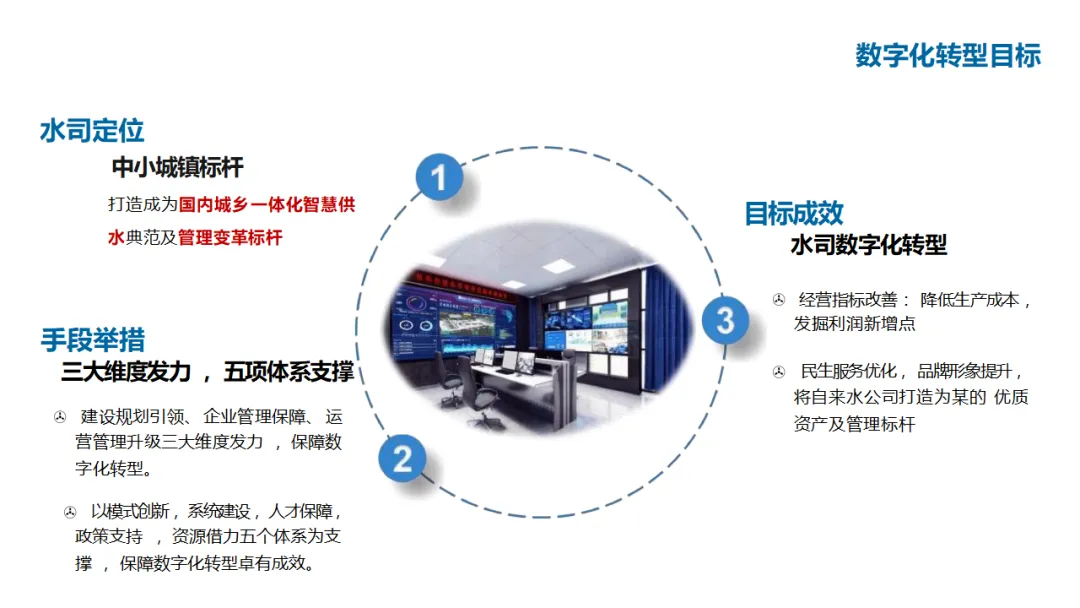 方案强调“标准引领、平台统一、分步实施”,通过顶层设计、人才培训、政策支持与资源借力(联合执法、行政授权)保障落地,最终实现经营指标改善(产销差下降、能耗药耗降低)、管理效率提升(工单闭环、调度科学)、民生服务优化(线上缴费、精准停水通知),将水司打造为国内城乡一体化智慧供水典范及管理变革标杆。