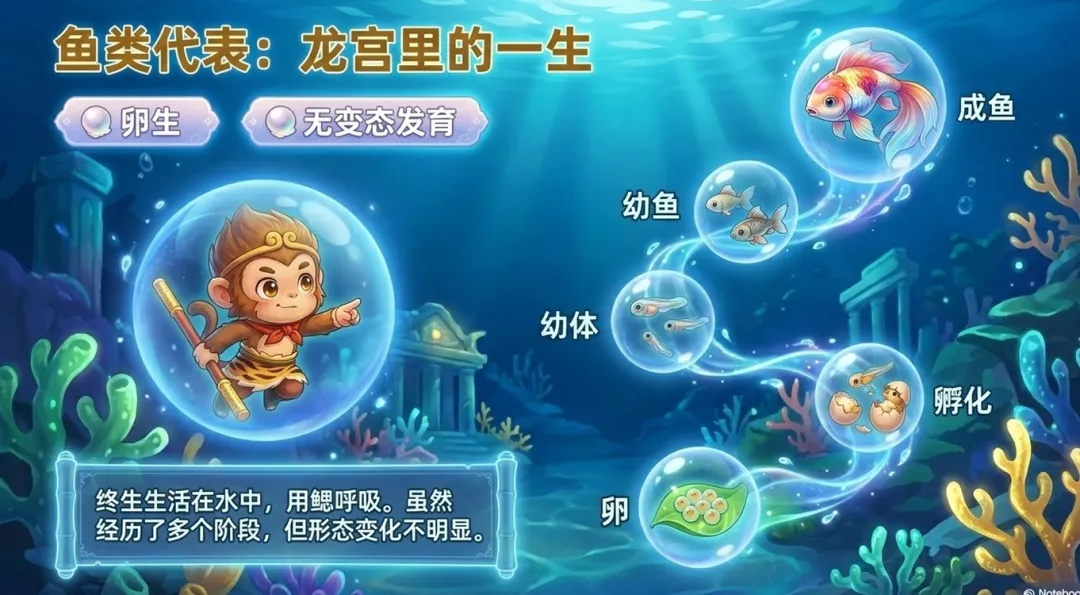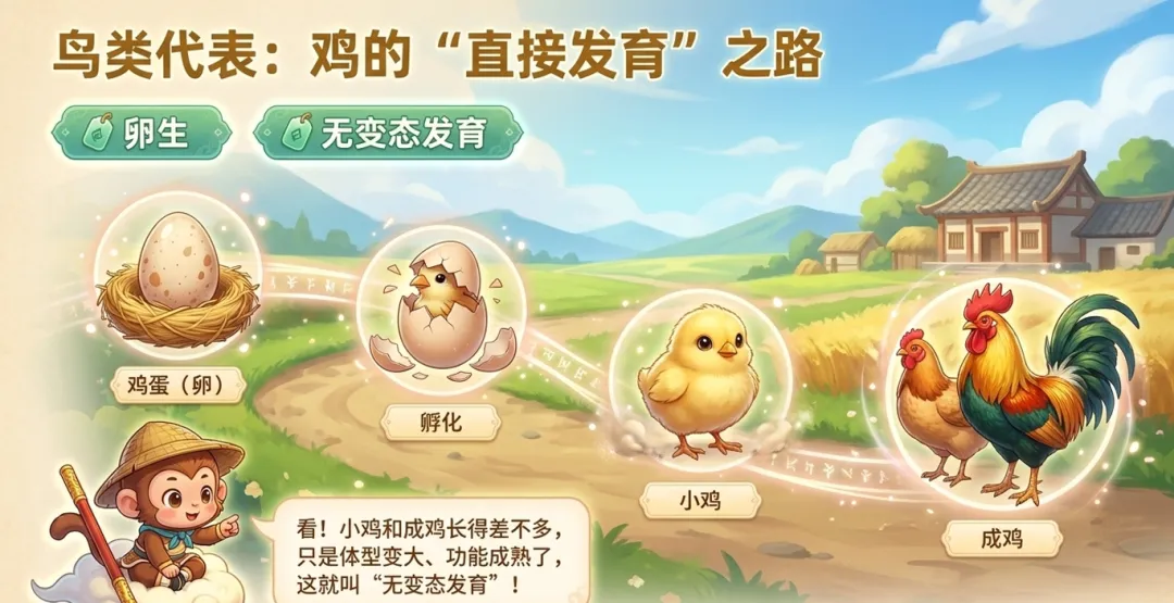 接着,课件通过三大差异来展开生命周期教学,分别是时间长短、形态变化和繁殖方式。这个分类很清晰,便于学生对比记忆。在具体例子中,课件选择了鸡作为鸟类的代表,说明小鸡和成鸡长得差不多,只是体型变大、功能成熟,由此引出无变态发育的概念。鱼类同样被归入无变态发育,用龙宫的一生这个说法来贴合西游记的主题,学生接受度会很高。