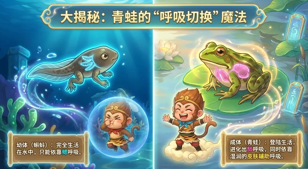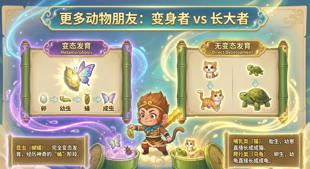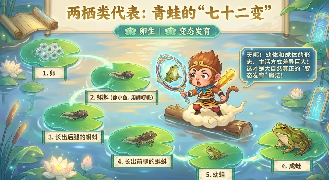 两栖类的代表是青蛙,课件把它比作真正的72变,并且专门用一页来揭秘青蛙的呼吸切换魔法,从鳃呼吸到肺呼吸兼皮肤呼吸,这个细节往往是学生最感兴趣也最容易混淆的地方。我同时设计了一个对比板块,叫做变身者比一比长大者,把完全变态和不完全变态的动物并列展示,有助于学生分类整理。