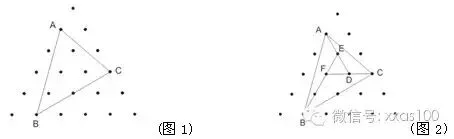 如图(2)所示,在△ABC内连接相邻的三个点成△DEF,再连接DC、EA、FB后是△ABC可看成是由△DEF分别延长FD、DE、EF边一倍、一倍、二倍而成的,不难得到S△ACD=2, S△AEB=3, S△FBC=4,所以S△=1+2+3+4=10(面积单位)。