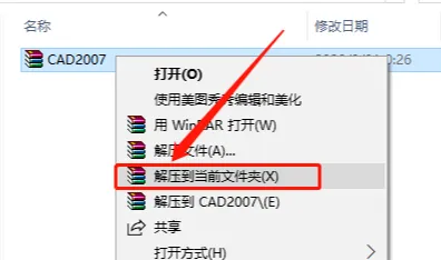 1.打开下载的软件安装包,鼠标右击压缩包【解压到CAD2007】。
